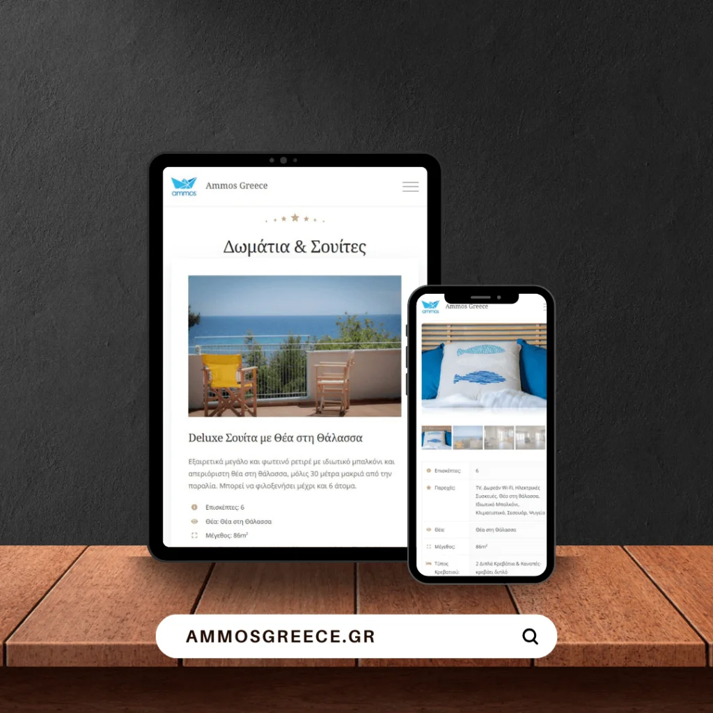Before the start of our cooperation, Ammos Greece had its own website in English, where guests could view the hotel’s facilities and rooms and make a reservation through a contact form. However, the website was not mobile-friendly, could not make reservations, was slow to load, lacked a secure connection and lacked automatic availability synchronization with third-party platforms (e.g. Booking).